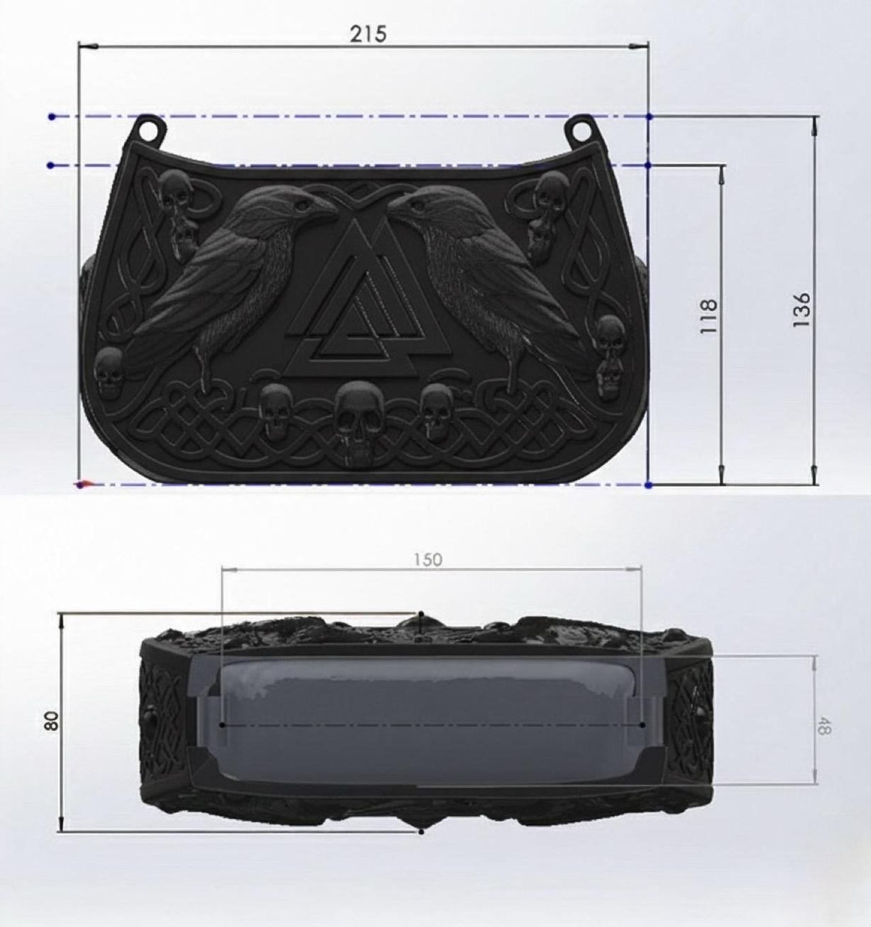 Su relieve central representa el símbolo de Odín, acompañado de cuervos y lobos: emblemas de intuición, fuerza y carácter.